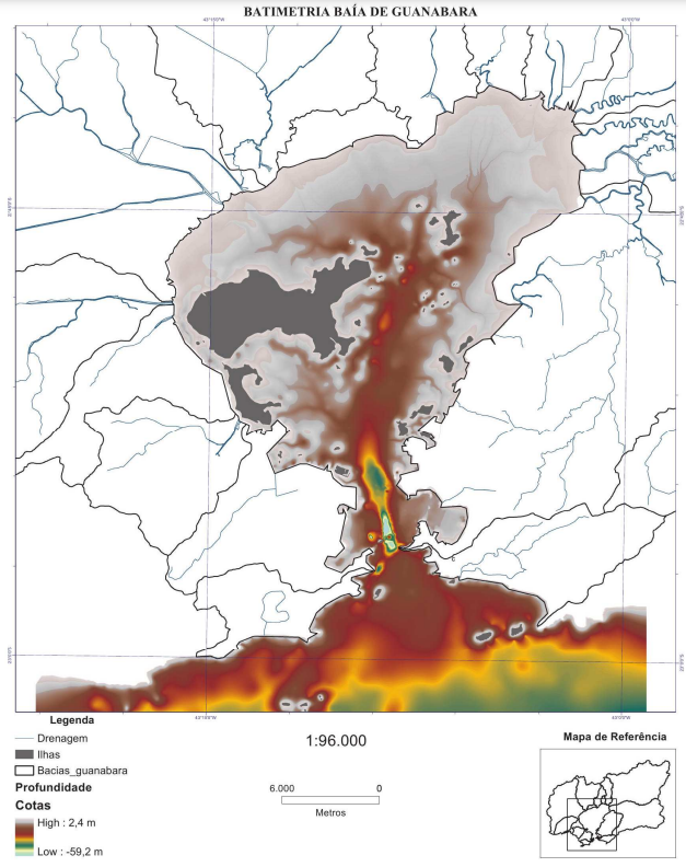 Apesar de sofrer diversas agressões ambientais, a Guanabara ainda se mantém viva devido a algumas características que favorecem a troca periódica de suas águas. Uma delas é a presença de um canal, com profundidade que ultrapassa os 50 metros em alguns pontos e que se estende desde a entrada da baía até o entorno da Ilha de Paquetá (veja as áreas em verde, amarelo e vermelho na Imagem 1). A presença desse canal permite que as águas limpas do Oceano Atlântico entrem e circulem pelo seu interior, renovando as águas poluídas da baía.