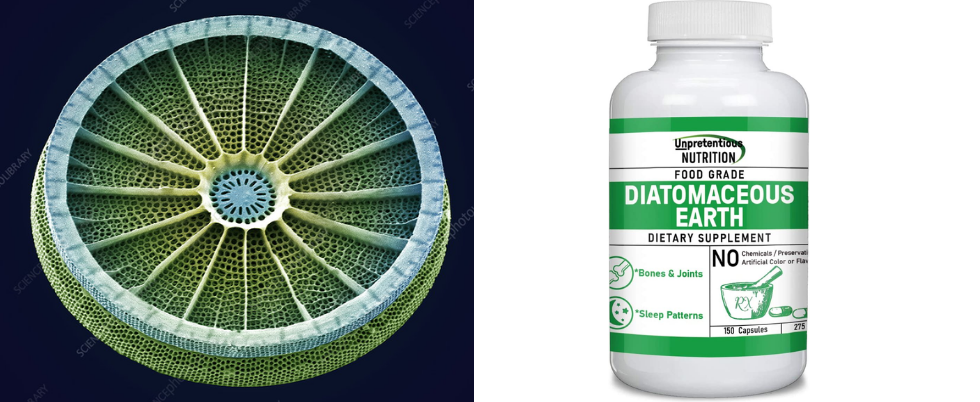 Suplemento alimentar de “terra de diatomáceas” (rocha porosa). Fonte : https://www.sciencephoto.com/media/16048/view/diatom-sem