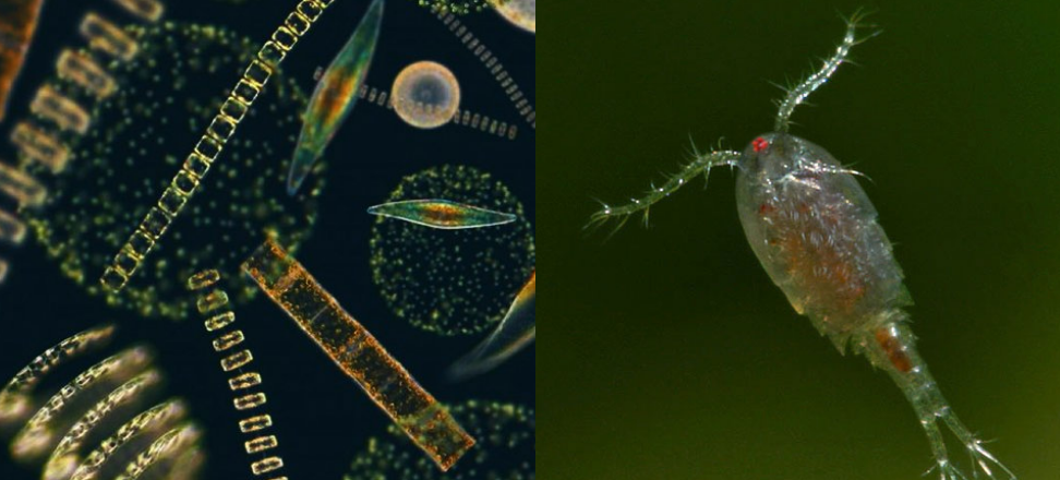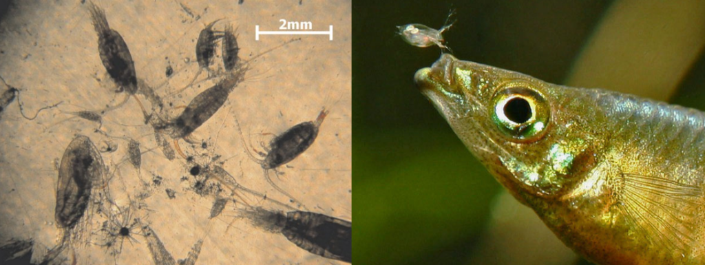 Zooplâncton com escala. Fonte: https://www.epa.gov/national-aquatic-resource-surveys/indicators-zooplankton#:~:text=The%20zooplankton%20community%20is%20an,in%20turn%20feed%20on%20themPulga d´água junto a um Iriatherina. Fonte: http://www.planetainvertebrados.com.br/index.asp?pagina=especies_ver&id_categoria=28&id_subcategoria=0&com=1&id=278&local=2