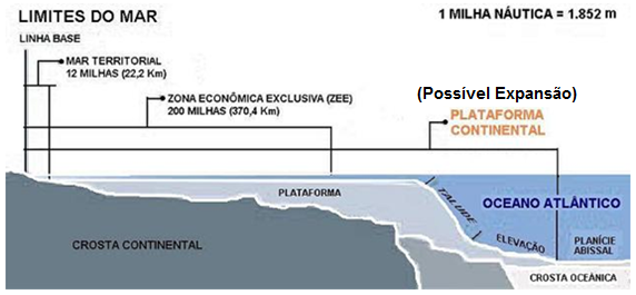 A Convenção das Nações Unidas sobre o Direito do Mar-CNDUM possibilita a expansão da Zona Econômica Exclusiva para além das 200 milhas com a incorporação da projeção da plataforma continental brasileira até a profundidade de 200 metros ou extensão máxima de avanço de 350 milhas náuticas. A plataforma continental é o platô submerso em frente ao litoral de suave declividade até a quebra da plataforma, local onde ocorre uma mudança brusca e acentuada da declividade conhecida como talude da plataforma.