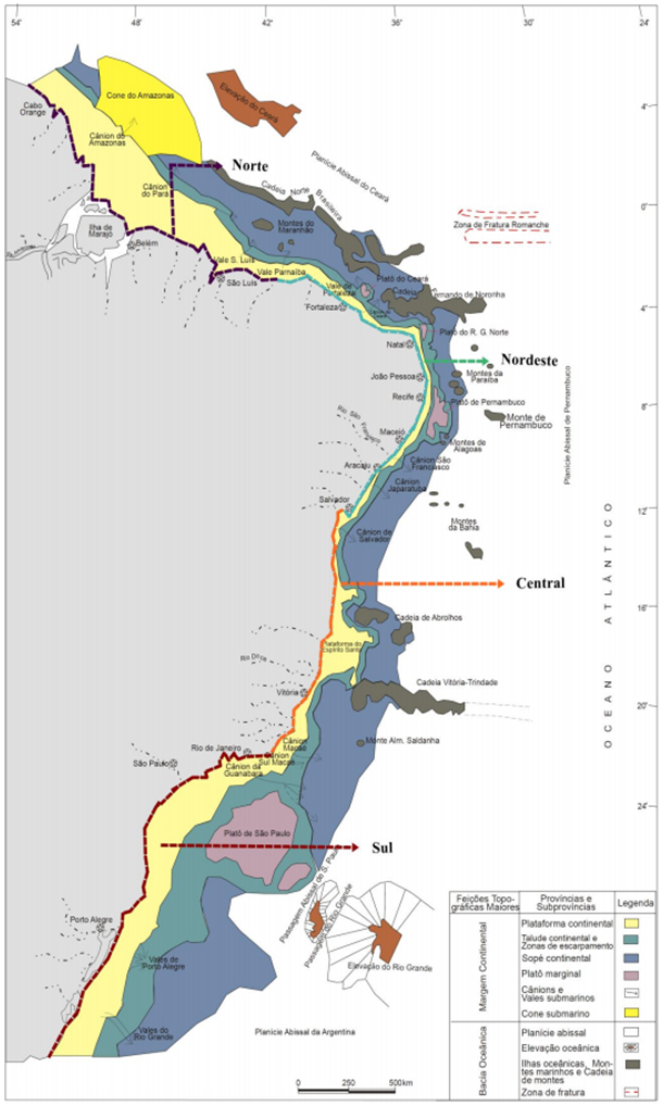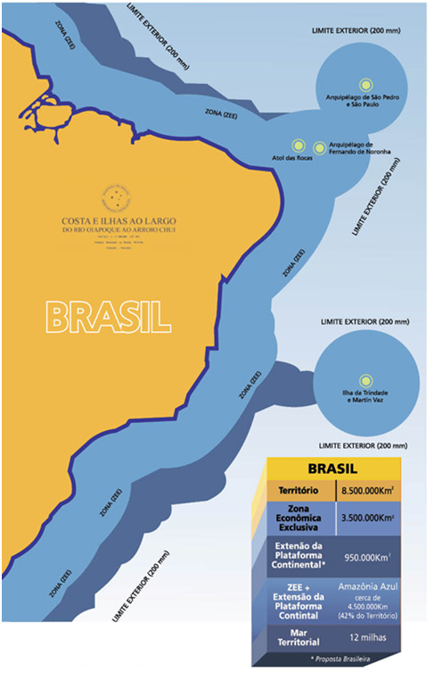 Observa-se tanto para região Norte como nas regiões Sul e Central, uma projeção da plataforma continental mar adentro e além das 200milhas náuticas tendo em vista o limite de 200metros de profundidade permitido pela ONU para efeito de delimitação da ZEE. Nestas condições o Brasil pode incorporar mais de 900mil Km² de território marinho sob seu domínio.