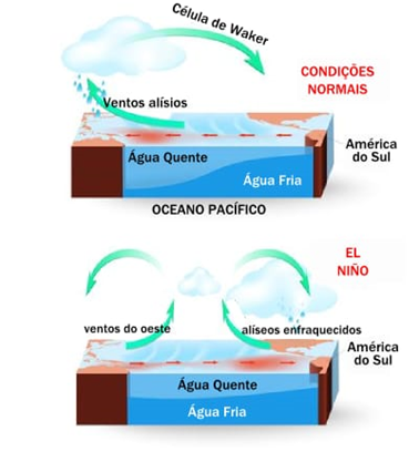 O El Niño Oscilação Sul (ENOS) é uma anomalia natural cíclica que acontece no Oceano Pacífico quando ocorre a diminuição da atuação dos ventos alísios. O enfraquecimento das altas pressões diminui a intensidade dos ventos alísios que são ventos que sopram na superfície dos trópicos em direção ao Equador. Essas correntes de ar são responsáveis por carregar calor e umidade dos oceanos para as áreas continentais equatoriais.