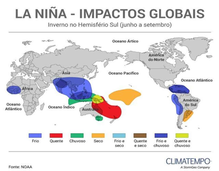El Niño e La Niña são efeitos extremos da interação oceano-atmosfera e proporcionam ao Brasil diferentes cenários climáticos, devido ao seu extenso litoral. As chuvas e as secas em excesso são alguns exemplos do que eles podem causar no Sul e no Nordeste. No ano de 2021, as características da La Niña já são perceptíveis mesmo em meados do mês de outubro (primavera), período antecipado ao habitual que é o verão.