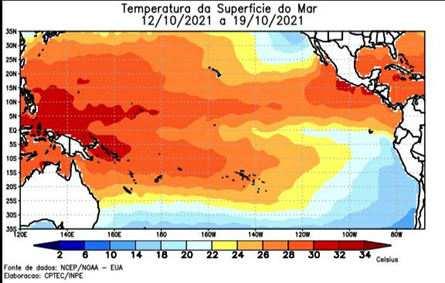As previsões de anomalia para outubro-novembro-dezembro de 2021 dos modelos numéricos de previsão climática analisadas indicam que as águas sobre o Pacífico Equatorial devem se apresentar mais frias do que a média histórica. Ou seja, existe maior probabilidade de desenvolver uma La Niña de fraca a moderada sobre o Oceano Pacífico Central até o primeiro trimestre de 2022.
