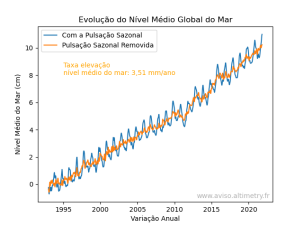 O que descobriu-se com a análise dos dados altimétricos, é que o nível médio global do mar subiu um total de 9,5 centímetros desde que o satélite TOPEX-Poseidon entrou em atividade em 1992. E a taxa está acelerando. Ao longo do século 20, o nível do mar subiu a uma taxa de cerca de 1,5 mm por ano; no início da década de 1990, a taxa era próxima de 2,5 mm por ano. Nos últimos 30 anos, a taxa média aumentou para 3,51 mm por ano.