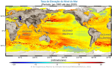 O mapa abaixo mostra as tendências globais do nível do mar em todo o mundo, observadas durante o período de 1993 a 2020 pela constelação de satélites altimétricos. Há variações espaciais na taxa de aumento do nível do mar, com algumas partes do oceano subindo mais rápido (representado em vermelho e laranja escuro) do que a taxa média global.