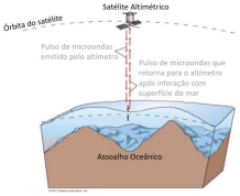 Essas informações são conhecidas porque podemos medi-las. Por mais de quatro décadas, grupos de pesquisas fazem uso de instrumentos a bordo de satélites, conhecidos como radares altimétricos, para monitorar a topografia da superfície do oceano – a forma e a altura dos picos e vales do oceano. Os radares altimétricos, ou altímetros, enviam repetidamente pulsos de radiação eletromagnética de microondas que interagem com a superfície do mar e são refletidas de volta para o satélite. O instrumento calcula o tempo que leva para o sinal retornar, enquanto também rastreia a localização precisa do satélite no espaço. A partir disso, é possível derivar a altura da superfície do mar na região que está imediatamente abaixo da órbita do satélite.