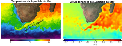 As correntes marinhas superficiais mais intensas transportam grande quantidade de massa e energia e, geralmente, possuem águas com temperatura e salinidade diferentes das massas de águas adjacentes. Nas figuras abaixo podemos ver o fluxo da Corrente das Agulhas contornando a porção sul do continente africano, e como ela modula a altura da superfície do mar nesta região.