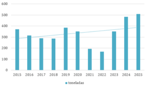 Repare que houve uma diminuição no ano de 2021 e 2022 devido às restrições contra COVID-19 mas nos anos subsequentes houve uma aceleração da quantidade de despejo de resíduos.