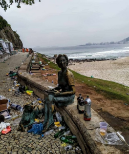 Os dados abaixo mostram a quantidade anual de lixo deixado na praia de Copacabana durante a noite de Réveillon. Ela só não parece ser crescente pois durante a passagem de ano em 2021 e 2022 houve uma queda brusca em decorrência da pandemia. Note que a partir da noite de ano novo de 2023 em diante a proporção de resíduos só faz crescer. Além da contaminação do resíduo propriamente dito existe a contaminação orgânica que redunda na presença de microrganismos patógenos que se proliferam num ambiente úmido, quente e contaminado de matéria orgânica.
