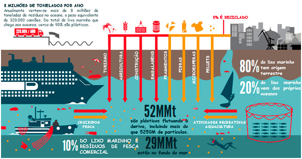 Existem questões relacionadas com a gestão inadequada do lixo das cidades, os descartes incorretos de resíduos que são lançados deliberadamente nas lagoas e rios e no final irão desembocar nos estuários, chegando nas praias. Porém, pesquisas apontam que as medidas para solucionar as questões do lixo nos oceanos ainda são escassas e incipientes, tanto no Brasil como no exterior.