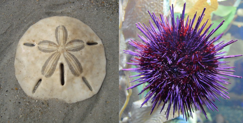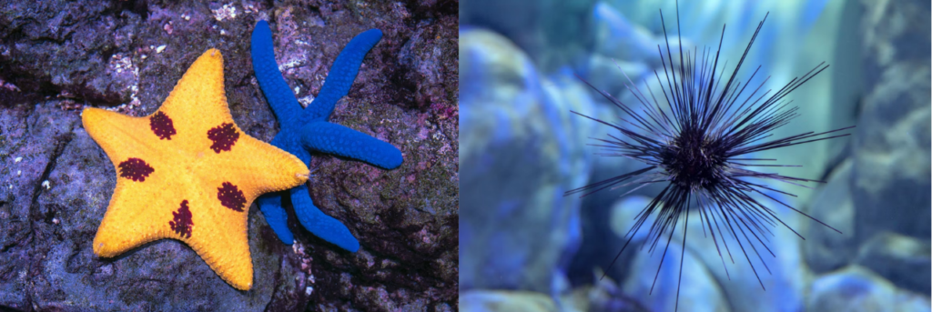 Como os grupos mais carismáticos e bem conhecidos do filo Echinodermata, tem-se a classe Asteroidea, que compreende as estrelas-do-mar, que recebem esse nome graças ao seu formato característico de estrela. Estes animais apresentam uma enorme diversidade no que diz respeito ao tamanho e forma dos braços, e coloração do corpo. Apresentam alta capacidade de regeneração, podendo desprender os braços para lidar com alguns predadores. Há também a classe Echinoidea, que compreende os ouriços-do-mar regulares, sendo animais globulares, herbívoros, que apresentam um aparelho com dentes retráteis para raspar a superfície com alimento. Os ouriços-do-mar irregulares mais conhecidos são as bolachas-da-praia, que apresentam um formato mais achatado e se alimentam essencialmente por filtração.